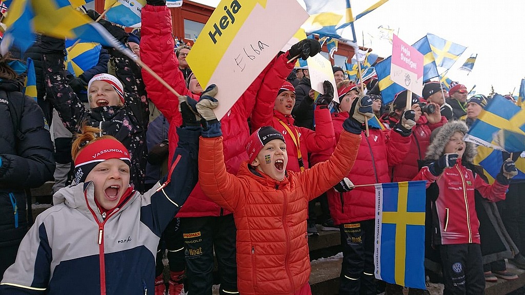Lördagen började tidigt med väckning 07.00. Vi sov i Prolympiaskolan en liten bit ifrån själva skidstadion i Östersund. Vi promenerade upp och fick frukost tillsammans med alla funktionärer som skulle arbeta under evenemanget. Därefter samlades vi för att få komma in och provåka banan på stadion och se var vi skulle tävla senare på dagen. När teståkningen var klar fick vi tid att gå runt och samla på mössor och andra reklamartiklar i de olika sponsortält som fanns på området. Vi provsmakade gruyèreost, körde stakmaskin, snackade med norrmän, gjorde egna hejaskyltar med mera... Humöret var på topp! Efter lunch var det dags för damerna att köra sitt första lopp i Tour 2020, 10 km fristil intervallstart. Vi hejade så mycket vi kunde från läktaren tills vi var tvungna att gå iväg till startområdet. Sedan var det vår tur att kliva ut på arenan... Mellan damernas och herrarnas lopp var det nämligen dags för finalstafetten i "Stjärna på skidor" inne på Östersunds arena. Det blev en spännande stafett med ganska röriga växlingar mellan de olika sträckorna, men barnen löste det på bästa sätt och vi hejade på varandra för fullt. Efter målgång var det en spänd väntan på slutresultaten då klubbarna ställde upp med flera olika lag.